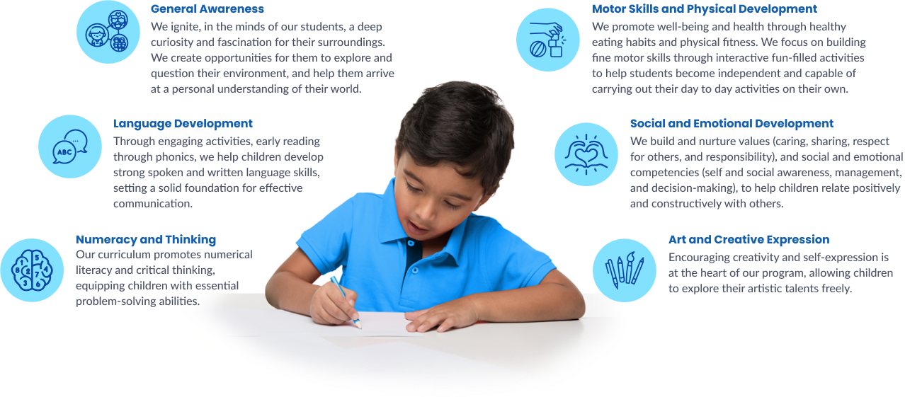 We promote well-being and health through healthy eating habits and physical fitness. We focus on building fine motor skills through interactive fun-filled activities to help students become independent and capable of carrying out their day to day activities on their own.